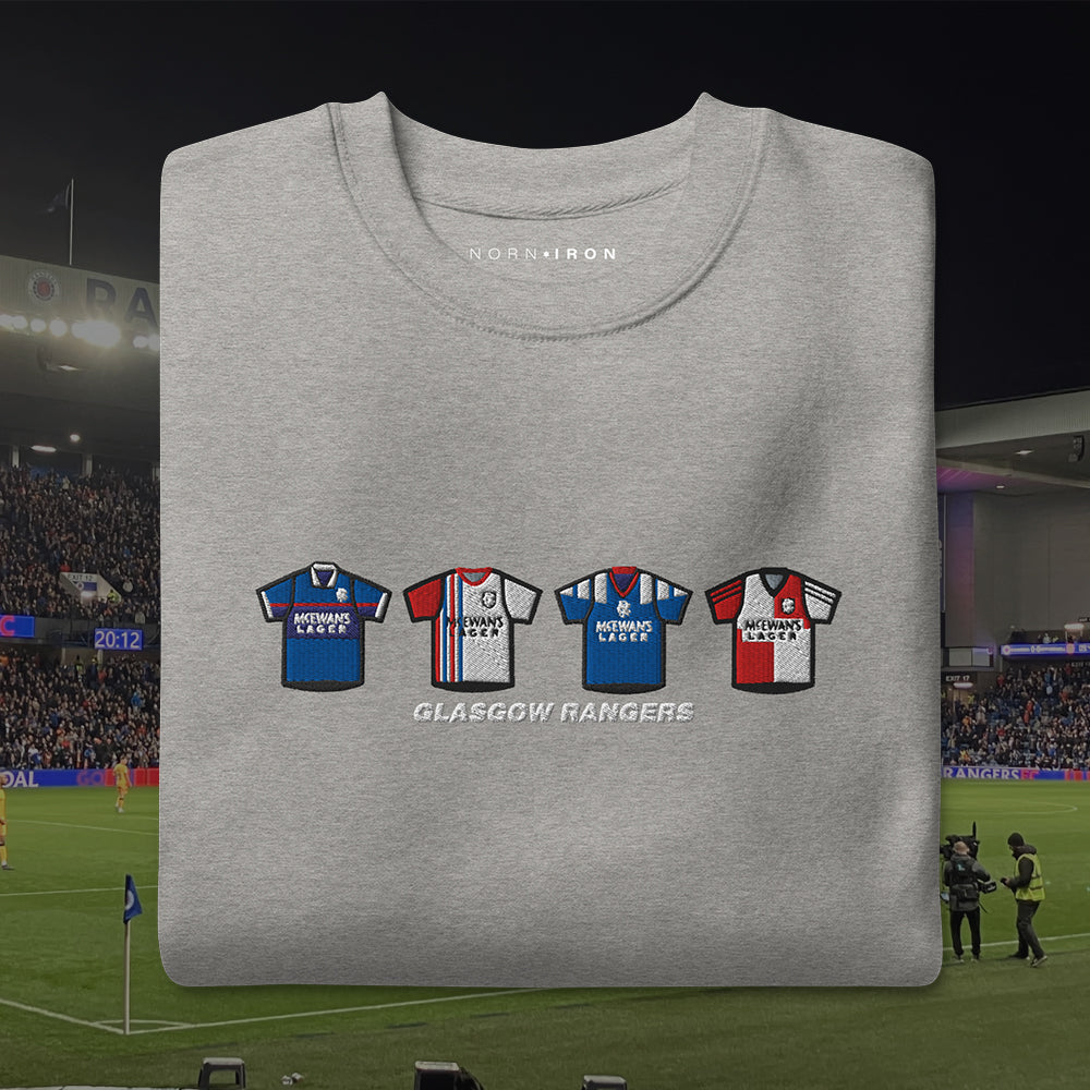 This embroidered unisex sweatshirt is the perfect choice for any Glasgow Rangers fan, the sweatshirt features retro football shirts from Glasgow Ranger's footballing past, adding a touch of nostalgia to your wardrobe. Show your support in style and stay warm on match days with our comfortable and stylish sweatshirt.